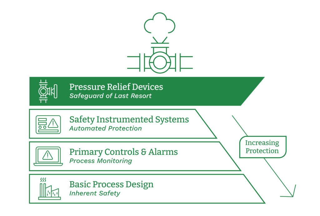 A simplified layer-of-protection diagram showing basic process control, alarms/interlocks, operator response and pressure relief as the final safeguard. Pressure relief is the last independent layer protecting people, assets and the environment when all other layers fail.